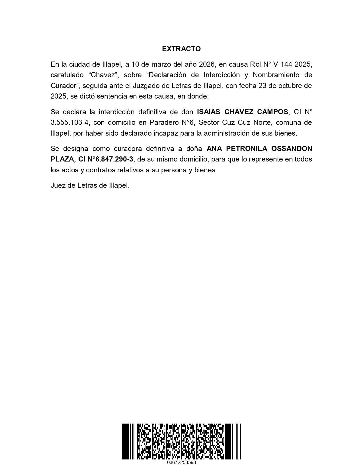 Extracto. Declaración de interdicción. Causa Rol V-144-2025. Juzgado de Letras de Illapel